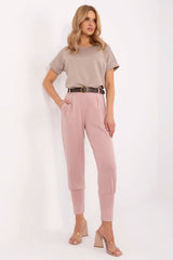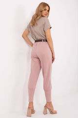 Elegant women's sweatpants combining casual style with a touch of elegance. Made from a high-quality blend of polyester, viscose, and elastane, they provide comfort and perfect fit. The high waist with elastic at the back ensures comfortable wearing, while the fastening belt accentuates the waist and adds chic. The smooth material makes the pants perfect for everyday wear, work, and more formal occasions. The model has side pockets and the cuffs are finished with ribbing, giving them a modern look. Ideal for women who appreciate style and comfort.