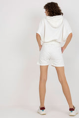 Tracksuit set consisting of a blouse and shorts. Blouse with short wide sleeves, hood and kangaroo pocket. Shorts with waist tie and slip pockets.