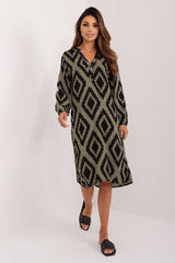 This summer dress is the perfect choice for every day, combining comfort, style and eco-consciousness. Its distinctive shirt cut makes it not only fashionable, but also practical and versatile. Made of soft and airy viscose, the dress is perfect for warm days, providing comfort and freedom of movement. Its long sleeve gives it versatility, allowing it to be worn not only in summer, but also on cooler days. The dress has a length reaching before the knee, which gives it a girlish and casual character. Its asymmetrical cut adds originality and modernity, emphasizing the wearer's individual style. The print gives the dress lightness and freshness, blending perfectly with the summer aura. The heart neckline subtly reveals the collarbones, adding femininity and delicacy to the entire styling. The embellishment is the buttons at the neckline, which give the dress an elegant touch. As an eco-friendly garment, this dress not only looks great, but also supports the idea of sustainable fashion, making it extra fun and satisfying to wear. It will be perfect as an everyday option for women who appreciate comfort, style and care for the environment.