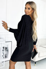 Bat dress with neckline. Made of elastic material with glitter. Dress in navy blue color. Brand numoco. Polish production.