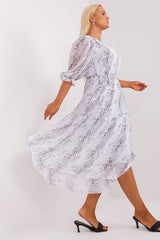 Plus size dress with 3/4 sleeves and round neckline. The dress has a lining, with a tie at the waist. A proposal ideal for many occasions.