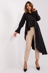 This shirt is a real gem of casual style with a subtle retro touch. Perfect for everyday outings, parties or meetings with friends. Long sleeves finished with a delicate frill adds charm and lightness to the shirt. The asymmetrical hem gives the whole a unique character, making you ready for any occasion. The button closure makes it easy to put on and take off the shirt, and the collar adds elegance. The dominant pattern is a subtle plainness, making this shirt versatile and easy to pair with a variety of looks. The length of the shirt makes it perfect for wearing over pants as well as leggings. It's not just a garment, it's an expression of personal style and a casual approach to fashion.