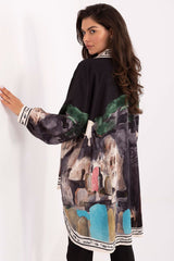 Women's casual shirt, perfect for everyday wear and work. Made of a lightweight and pleasant to the touch blend of viscose and polyester, it ensures comfort throughout the day. A model with a longer cut, featuring a classic collar and long sleeves fastened with buttons hidden under an elegant flap. The entire surface of the fabric is printed, and additional details in the form of inscriptions on the collar, flap, and around the bottom give the shirt a modern, unique character. This is a proposal for women who appreciate comfort combined with original style.