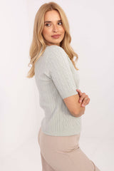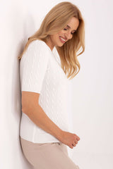 Women's casual sweater is a comfortable and versatile option for everyday wear and work. Made from a soft blend of viscose, polyester, and nylon, it ensures comfort while maintaining an elegant look. A standard length model with short sleeves and a round neckline stands out with a varied texture of the material, which adds style and originality. The lack of fastening makes the sweater easy to put on and perfect for many daily stylizations.