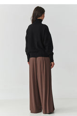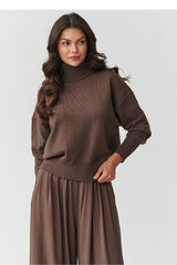 Invest in elegance and comfort at its best. This women's turtleneck sweater is a must-have in every wardrobe. Made of high-quality fabric with a unique composition of 51% viscose, 30% PBT, and 19% nylon, it impresses with its softness, elasticity, and durability. Thanks to the advantage of viscose, the sweater is extremely pleasant to the touch, allows the skin to breathe, and beautifully drapes on the silhouette. The addition of synthetic fibers ensures that the material does not deform, retains its shape even after many washes, and does not pill, guaranteeing the longevity of the product. Why choose this model? The classic turtleneck protects against the cold and adds elegance, perfect for autumn and winter. The oversized cut with slightly dropped shoulders provides freedom of movement and comfortable wear. Elastic cuffs on the sleeves and at the bottom of the sweater give the whole a fashionable character. The universal design will work perfectly in both everyday, casual stylizations and more elegant outfits for work or meetings. It pairs well with classic jeans, elegant trousers, or a pleated skirt. You can wear it with both ankle boots and sporty sneakers and always look stylish. If you are looking for a sweater that combines comfort, quality, and timeless style, this turtleneck model will be your favorite wardrobe piece for many seasons.