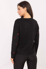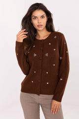 Casual women's sweater of standard length, ideal for everyday wear and work. Made of high-quality blend of polyester, wool, and acrylic, it is soft, pleasant to the touch, and durable. The model stands out with a charming heart-shaped embroidery, which adds a subtle, feminine character to it. The sweater has long sleeves, a classic round neckline, and a practical button closure, making it a comfortable and versatile wardrobe item. It is a perfect choice for women who like to combine everyday comfort with a delicate touch of romantic style.