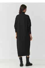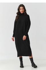 Discover a timeless classic in a modern edition - a midi sweater dress with a turtleneck is the perfect choice for cooler days when you want to look stylish and feel comfortable. Its simple, slightly oversized cut subtly slims the silhouette, and the knee-length makes it suitable for work, meetings, or evening outings. Made of high-quality fabric with a carefully selected composition: viscose, which is soft, breathable, and pleasant to the touch, PBT ensures flexibility and durability, and nylon maintains the dress's shape and prevents pilling. The turtleneck gently wraps around the neck and adds an elegant character, while the long sleeves provide comfort and warmth. Its minimalist design allows for playful accessorizing, looks great with a belt, boots, or ankle boots, and the side slits add lightness and emphasize a feminine style. Available in stylish, versatile colors that fit perfectly into autumn-winter trends. This midi sweater dress is a must-have in every wardrobe. With it, you can create many fashionable outfits that combine comfort and elegance.