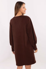 Oversized sweatshirt dress with a casual character perfect for everyday wear. Made of a blend of viscose, polyester, elastane, and modal, from a buttery soft material that is incredibly soft, delicate, and exceptionally pleasant to the touch. The smooth model, knee-length, with a classic, round neckline. Long billowy sleeves add lightness and feminine charm, breaking the simple oversized form. This is a comfortable and stylish proposal that will work both in the comfort of your home and in everyday urban stylizations.