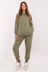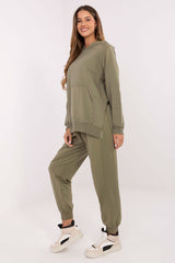 Oversize women's sweatshirt in a casual style, perfect for everyday occasions. Made of cotton with elastane, it is soft, comfortable and pleasant to wear. The smooth pattern makes it easy to match to different stylings. Model of standard length with a hood and long sleeves. There is a practical kangaroo pocket on the front, and side slits give the sweatshirt lightness and a fashionable character. It is the perfect choice for women who value comfort combined with modern style.