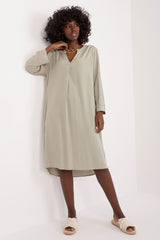 This everyday dress is a combination of comfort and style. Made of high-quality viscose, it is lightweight and breathable, perfect for everyday wear. The oversized fit ensures freedom of movement and comfortable wear, while the solid fabric gives it an elegant, minimalist look. The dress falls below the knee, making it suitable for both work and social gatherings. The V-neck adds a feminine charm, and the practical pockets hidden in the side seams are a convenient and functional addition. This dress is a perfect choice for women who appreciate style and comfort in their daily lives.