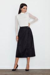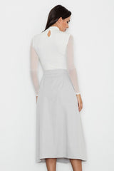 A long skirt made of delicate material with a fastening at the waist perfectly emphasizes the feminine figure. Two visible buttons at the waist add extra charm.