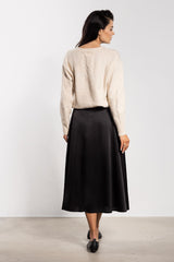 Satin midi skirt is a classic and elegant wardrobe piece. The delicate sheen of the fabric adds a unique character to the styling, working well both for everyday wear and for more formal occasions. The high waist beautifully emphasizes the waist and visually elongates the silhouette. The flared cut provides freedom of movement and lightness, while the knee-length adds timeless elegance to the whole look.