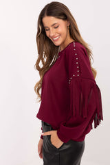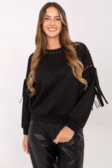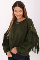 Women's casual sweatshirt in a smooth version is a stylish proposal for everyday wear. Made of a soft blend of viscose and polyester, it provides comfort and convenience throughout the day. The classic, round neckline has been decorated with subtle studs, adding a modern character to the whole. Long sleeves with eye-catching fringes and studs application make the sweatshirt stand out against everyday stylizations. Standard length and no fastening make it a practical yet unique wardrobe item.