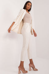 Elegant chino trousers made of smooth material dominated by polyester. They are perfect for various occasions, both for everyday wear, for work, and for more formal visits. Thanks to their high waist, they provide comfort and a stylish look. Straight legs add a classic touch, while the zipper and button closure ensure usability. Additionally, they are equipped with a fastening belt and practical slip pockets, making them not only aesthetic but also functional wardrobe item.