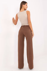 These women's material trousers are a proposal for women who appreciate classic style in a modern version. Made of high-quality cotton and elastane blend, they provide comfort and perfect fit to the silhouette. The high-waisted model beautifully emphasizes the waist, while the wide legs give the outfit lightness and an elegant character. The trousers are fastened with a zipper and button, guaranteeing comfort and aesthetic finish. Side pockets add practicality and a classic look. Their smooth pattern and elegant style make them perfect for everyday wear, work, and formal meetings. They are a versatile wardrobe piece that you can easily match with a shirt, blouse, or blazer.